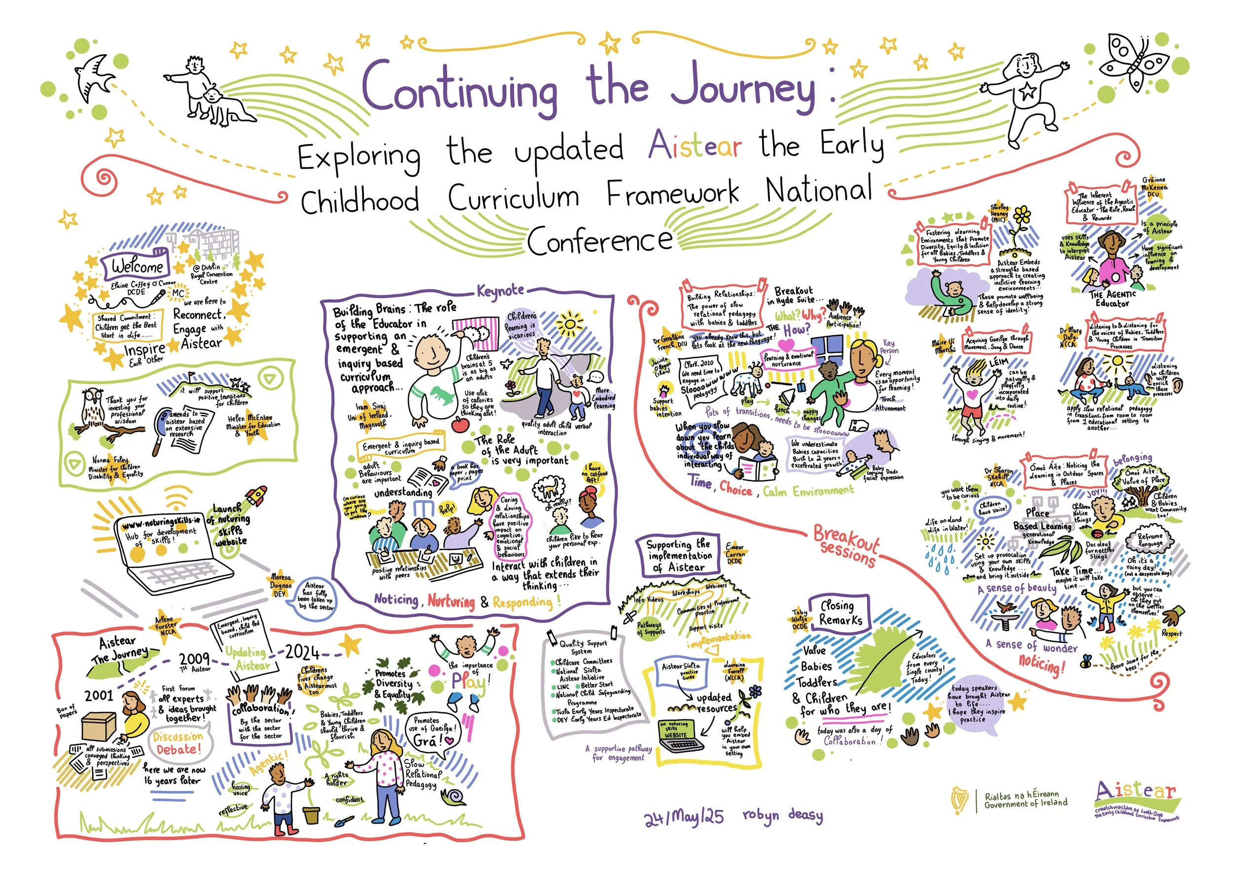 This colourful live drawing was created at the 2025 Aistear (The Early Childhood Curriculum Framework) Conference hosted by the Department of Children, Disability and Equality.